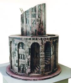 Modellmaterial, farbig und graphisch bearbeitete Papiere; Höhe zwischen 30 un d 50 cm "Seelenweg-Modelle" hat sie jemand genannt. Sie bilden keine realen Wege und Gebäude ab, sondern handeln symbolisch von Ängsten und ihrer womöglichen Überwindung. |